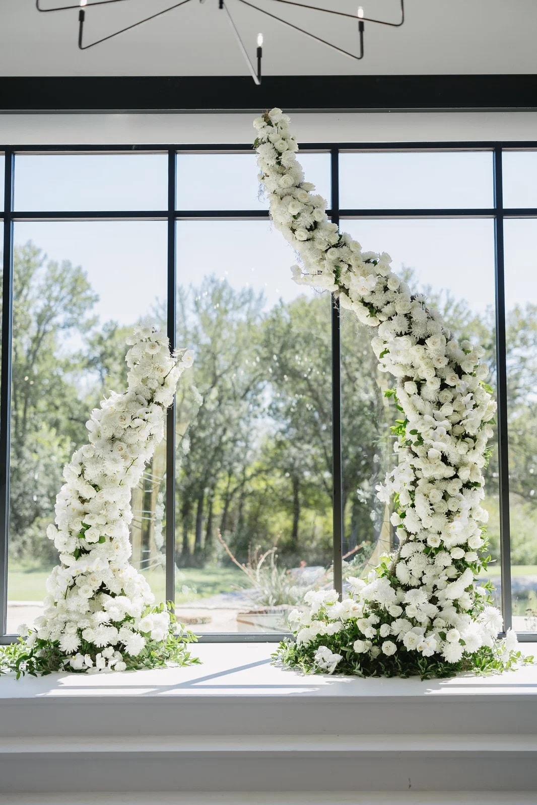 Lush, suspended floral arrangements create a ceiling of blooms over dining tables, dance floors, or seating areas. This immersive installation can feature rare flowers like orchids, peonies, and garden roses, combined with cascading greenery for a luxurious, garden-like atmosphere.